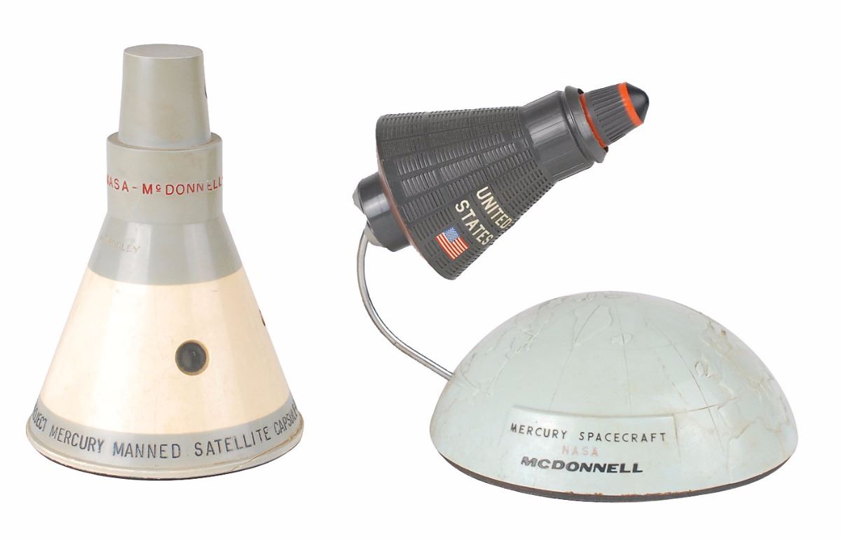 Two items: a Topping Inc. model of the McDonnell–NASA manned satellite capsule for Project Mercury, standing 6? tall, encircled with embossed lettering along the base and top; and a Topping Inc. model of a Mercury spacecraft capsule, standing 4.25? tall, accompanied by a felt-bottomed globe segment with a curved metal holder for suspending the capsule. The orange escape tower is missing. Light soiling, a crack to the base, and ownership notations carved into the side of the manned satellite capsule, and light overall soiling to the globe segment, otherwise fine condition. Accompanied by a NASA envelope addressed to “Mr. and Mrs. John Yardley.” Consignor notes that the models originate from the estate of Yardley, the McDonnell project engineer who oversaw the 1958 building of the Mercury spacecraft.