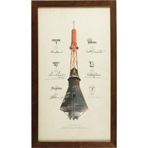 <B>Project Mercury Spacecraft Signed Color Poster,</B></I> 11.5" x 21.5". Signed beneath the spacecraft's symbol and flight information by each of the six Mercury astronauts who flew in the 1961-1963 program: "<I>Alan Shepard,</B></I>" "<I>Gus Grissom,</B></I>" "<I>J.H. Glenn, Jr.,</B></I>" "<I>Scott Carpenter,</B></I>" "<I>Wally Schirra,</B></I>" and "<I>Gordon Cooper.</B></I>" The image is captioned "<I>Mercury Spacecraft/ Designed and built by McDonnell, St. Louis/ for the National Aeronautics and Space Administration.</B></I>" Pictured in color is the Mercury capsule with the escape tower attached on top. Lightly soiled. Perhaps the rarest and most desirable of all signed Project Mercury memorabilia. Framed to 13.5" x 23.5". <I>From the collection of renowned former physical trainer of the astronauts Joe Garino. This lot is accompanied by a signed certificate of authentication from Garino verifying its provenance.</B></I><BR><BR><b>Shipping:</b> Framed - with Glass, Medium (<a target="_blank" href="http://www.heritageauctions.com/common/shipping.php">view shipping information</a>)