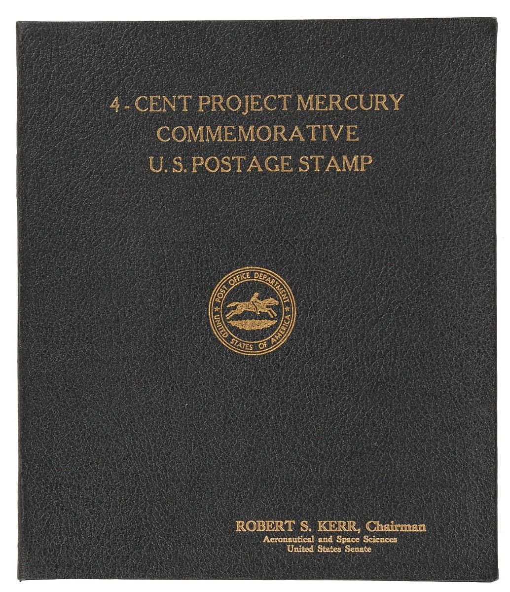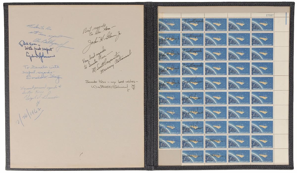 Extraordinary stamp set given to Senator Robert S. Kerr, chairman of the Senate Committee on Aeronautical and Space Sciences, consisting of a sheet of 1962 four-cent Project Mercury postage stamps in a black hardcover presentation folder, signed and inscribed inside the folder’s cover by Vice President Lyndon B. Johnson, Alan Shepard, Gus Grissom, Deke Slayton, John Glenn, Scott Carpenter, and Wally Schirra, all of whom sign using their formal full names. The same six Mercury astronauts also sign a total of twenty-one individual postage stamps, with Shepard signing one stamp and the others each signing four. In fine condition. From the estate of Senator Kerr. Kerr succeeded Johnson as chairman of the committee in 1961 when Johnson became vice president, serving in the position until his death in 1963. A superior piece connecting America’s space program with the politicians who made it possible.