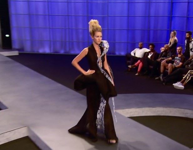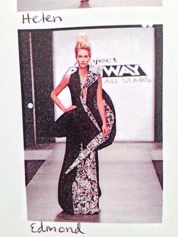 Project Runway All Stars, Season 6, Episode 7: "A Kick in the Astro" - Garment # 687 - Designer: Edmond. Avant Gard Challenge. Edmond's design was inspired by Quasar and the feel of Space. He designed a long black dress made of black mesh and a digitally printed white and grey fabric. The dress has a deep v-neck and exaggerated strip of fabric that floats around the body of the dress.