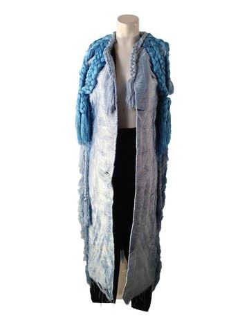 Project Runway All Stars, Season 6, Episode 7: "A Kick in the Astro" - Garment # 682 -Designer: Fabio. Fabio was inspired by Neptune for this challenge. He designed a 2-piece look with a long, light blue jacket that ties at the waist to become a dress, with black leggings underneath. The jacket features braided fringe over the shoulders and the material is a light quilt with a slight sheen.