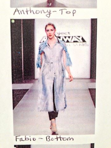 Project Runway All Stars, Season 6, Episode 7: "A Kick in the Astro" - Garment # 682 -Designer: Fabio. Fabio was inspired by Neptune for this challenge. He designed a 2-piece look with a long, light blue jacket that ties at the waist to become a dress, with black leggings underneath. The jacket features braided fringe over the shoulders and the material is a light quilt with a slight sheen.
