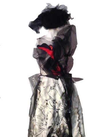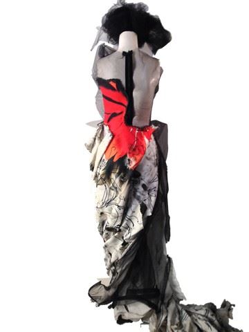 Project Runway All Stars -Season 6, Episode 2: "Damsels in Distress" - garment #631 - Designer: Anthony. This was the winning look for this episode! Anthony used charcoal and a blowtorch for this creation. It is a long white dress with a large red flower print and a subtle black pattern. The dress has black mesh along the top and overlaid on the sides, with additional black mesh to use for the hairpiece. Fabric was glued to the mesh and is coming off in some places. The entire dress has been tattered and distressed as per the assignment. Anthony's inspiration story is about a princess from Gambia that caught on fire. Judges called it elegant and balanced, and distressed and fresh as a daisy.