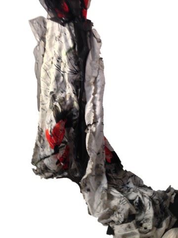 Project Runway All Stars -Season 6, Episode 2: "Damsels in Distress" - garment #631 - Designer: Anthony. This was the winning look for this episode! Anthony used charcoal and a blowtorch for this creation. It is a long white dress with a large red flower print and a subtle black pattern. The dress has black mesh along the top and overlaid on the sides, with additional black mesh to use for the hairpiece. Fabric was glued to the mesh and is coming off in some places. The entire dress has been tattered and distressed as per the assignment. Anthony's inspiration story is about a princess from Gambia that caught on fire. Judges called it elegant and balanced, and distressed and fresh as a daisy.