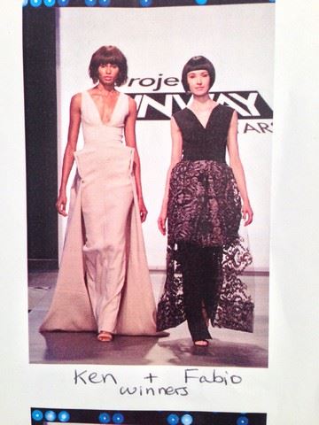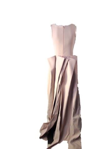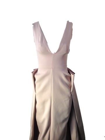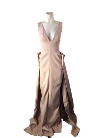 Project Runway All Stars - Season 6, Episode 3: "Perfect Pairings"-garment # 638 - Designer: Ken -This was the winning look with Fabio in the Perfect Pairings episode. Ken was inspired by the clean lines of his dish (guinea hen duo) and lands on a nude, floor-length gown with a plunging neckline and over-exaggerated hips.
