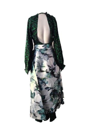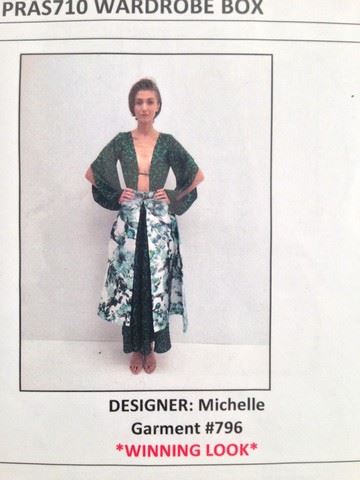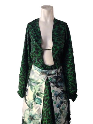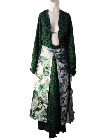 Project Runway All Stars - Season 7, Episode 10: "Climate Quick Change"-garment # 796- Designer: Michelle. This was the winning look in this episode and was a "wind to rain" transition silhouette. A two- piece green and black leopard pantsuit with plunging neckline and slit sleeves, with off white, floral print skirt overlay. Skirt overlay has sleeves and transitions to a rain jacket. Judges thought this was one of the trickiest transitions but were still sold on it being "genius". They also loved the two prints together.