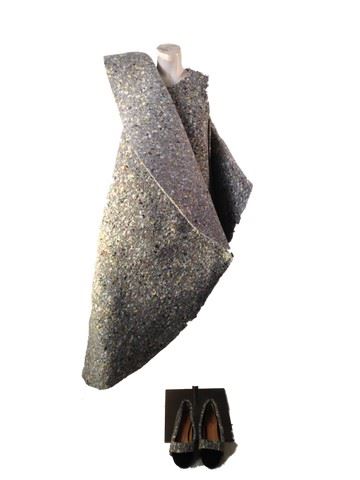 Project Runway All Stars Season 7, Episode 7: Avant-Garde Challenge-garment # 780 - Designer: Michelle. This was the runner up look of the episode. Michelle named this dress "Sensory Deprivation". It is a two-piece dress with single shoulder jacket that has a curved circle collar on one side. The entire dress and shoes are made from carpet padding. The intent was to feel as if at any time you can revert to a cocoon. Judges called it innovative with a "wow" factor and stunning with an element of surprise and reveal.