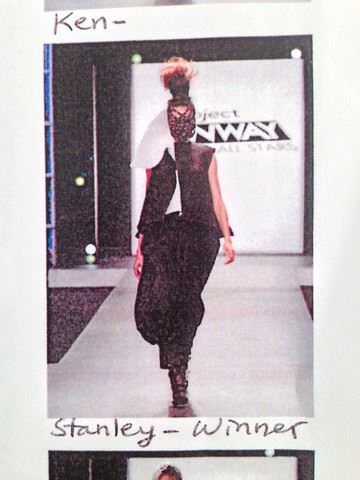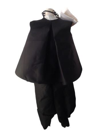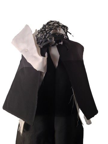 Project Runway All Stars - Season 6, Episode #7 "A Kick in the Astro" - garment #685-Designer: Stanley - This was the Avant Guarde challenge and the winning look of the episode. Stanley was inspired by a solar eclipse for this ensemble. This is a four- piece wardrobe set with a puffy leg, black romper, white blouse with unique bow shooting out, black vest coat, and a face mask made of boning and gemstones. Face mask has loosened and is missing some gemstones from wear on the show. Judges loved the proportions and called it "irresistable"!