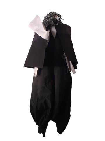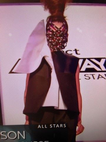 Project Runway All Stars - Season 6, Episode #7 "A Kick in the Astro" - garment #685-Designer: Stanley - This was the Avant Guarde challenge and the winning look of the episode. Stanley was inspired by a solar eclipse for this ensemble. This is a four- piece wardrobe set with a puffy leg, black romper, white blouse with unique bow shooting out, black vest coat, and a face mask made of boning and gemstones. Face mask has loosened and is missing some gemstones from wear on the show. Judges loved the proportions and called it "irresistable"!