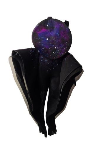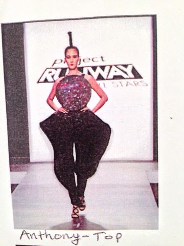 Project Runway All Stars- Season 6, Episode 7: "A Kick in the Astro" -Garment # 679 -Designer: Anthony. This is the episode when designs were based on the cosmos, the Avant-Garde challenge. Anthony designed his look inspired by the Milky Way. it is an all black sleeveless jumpsuit with an open back, large exaggerated pant legs, and a circle detail on the bodice that is painted purple with white and blue colors, resembling the cosmos. This look was rated high by the judges in this episode.