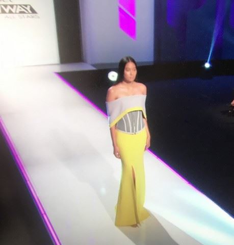 Project Runway All Stars- Season 7- Episode 4: "Corsets of Fashion"- Garment # 744-Designer: Anthony Ryan. Anthony designed a yellow, strapless floor length, flowy dress with a grey with white boning corset worn over the top, and a grey, off the shoulder caplet trimmed in yellow. High slit in the front. Anthony described this as "an organic dress that fell over the bustier".