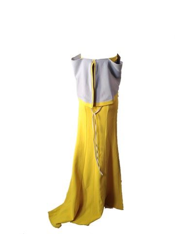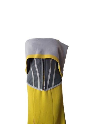 Project Runway All Stars- Season 7- Episode 4: "Corsets of Fashion"- Garment # 744-Designer: Anthony Ryan. Anthony designed a yellow, strapless floor length, flowy dress with a grey with white boning corset worn over the top, and a grey, off the shoulder caplet trimmed in yellow. High slit in the front. Anthony described this as "an organic dress that fell over the bustier".