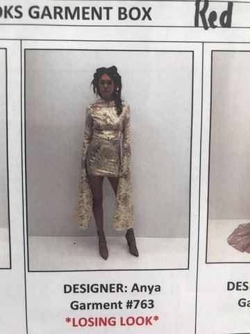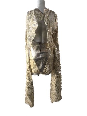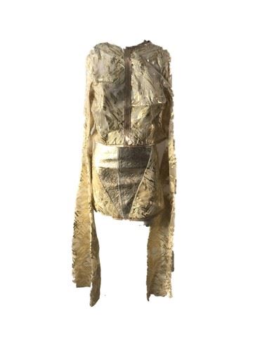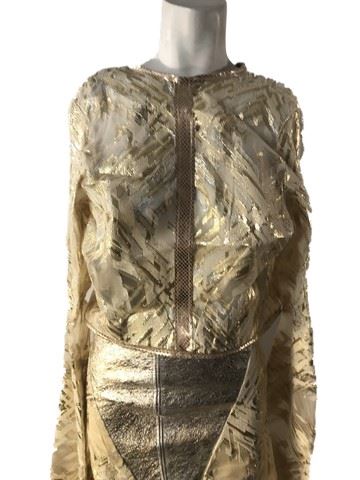 Project Runway All Stars, Season 7, Episode 6: "Pedal to the Metal" (Red Carpet with Metallics) - Garment # 763 - Designer: Anya. Anya used a brocade fabric to design this 2-piece look with a long sleeve gold sheer printed top, and a gold and silver metallic mini skirt to match. Top has an open back. The Grammy's was her inspiration. Anya was eliminated from this episode.