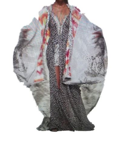 Project Runway All Stars, Season 7, Episode 5: "On the Prowl" -Designer: Anya. Anya was inspired by a Budgeriger. The silhouette is black and white print with pops of color throughout. The fabric is sheer with long flowing arms. It has black and white feathers around the neck and long, bright colors in the back.