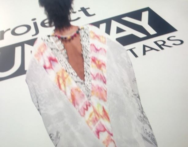 Project Runway All Stars, Season 7, Episode 5: "On the Prowl" -Designer: Anya. Anya was inspired by a Budgeriger. The silhouette is black and white print with pops of color throughout. The fabric is sheer with long flowing arms. It has black and white feathers around the neck and long, bright colors in the back.