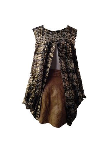 Project Runway All Stars - Season 7, Episode 13: The Finale-garment # 821 -Designer: Biddell. His collection title was "The Queen of England as a Reptile." He wanted to mix street styles with an aggressive elegance. Chiffon top with gold and black design, the top is open in a loop design on the sides and has a v- neck type opening in the back, the skirt is a pleather and cork material that zips up the front, large seem down the sides that is protrusive so hips appear to be wide.