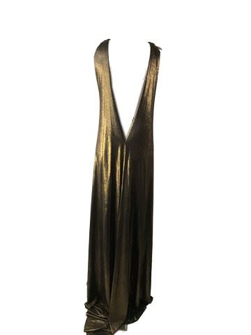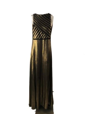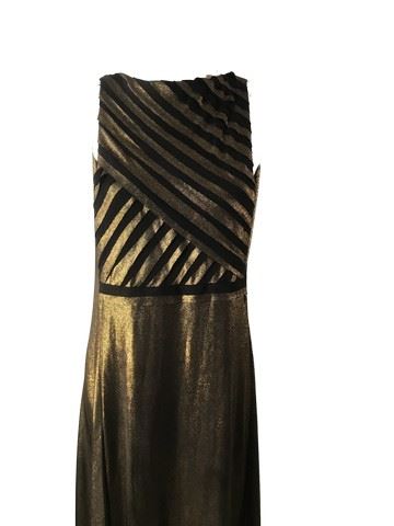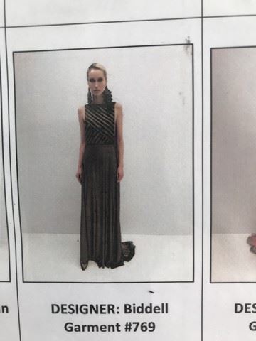 Project Runway All Stars, Season 7, Episode 6: "Pedal to the Metal" (Red Carpet with Metallics) - Garment # 769 -Designer: Biddell. Biddell used The Oscars for his inspiration. He designed this gold metallic, floor length gown, with black and gold horizontal/diagonal stripes on the bodice of the gown. It has a small front with a floating, deep V back. Biddell also used gold and black chandelier earrings to match. His idea was to "create a texture out of something smooth". Judges loved how it is "a completely different shape with every angle."