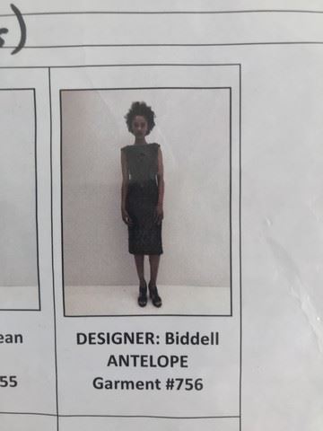 Project Runway All Stars, Season 7, Episode 5: "On the Prowl" -Garment# 756 -Designer: Biddell. Biddell used an Antelope for his inspiration. He designed a brown, metallic knee length, fitted, cap sleeve dress with brown braided leather at the shoulders, waist and the bottom. The back of the dress is completely open.