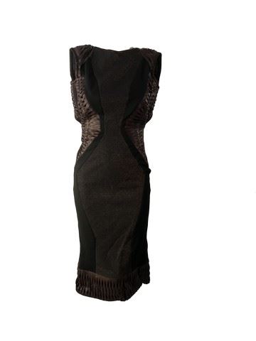 Project Runway All Stars, Season 7, Episode 5: "On the Prowl" -Garment# 756 -Designer: Biddell. Biddell used an Antelope for his inspiration. He designed a brown, metallic knee length, fitted, cap sleeve dress with brown braided leather at the shoulders, waist and the bottom. The back of the dress is completely open.