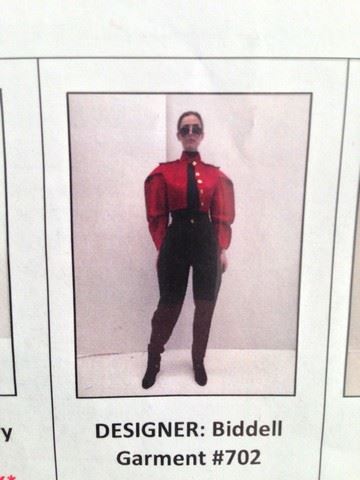 Project Runway All Stars- Season 7, Episode 1: "All Stars Goes Global-"- Garment #-702 - Designer Biddell. Biddell designed a red, satin, volumized, cropped military style jacket with puffed sleeves and gold buttons. Includes a black sleeveless shell underneath the jacket, and army green wool trousers that have an oversized pleat on the front and tapered bottom. Inspired by his home country: Canada.