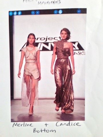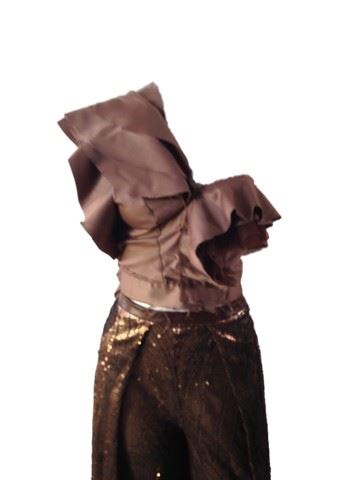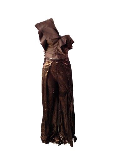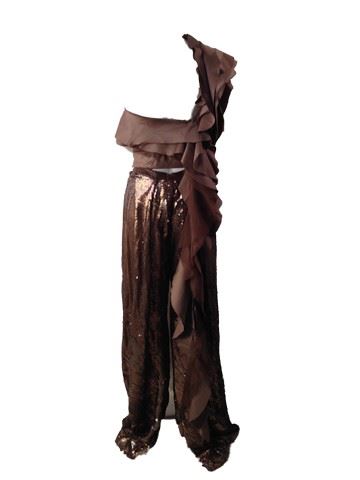 Project Runway All Stars - garment # 463- Season 6, Episode 3 - Designer- Candice - This asparagus inspired silhouette is a 2 piece look with brown sequin wide leg pant and a brown ruffled one shoulder top.