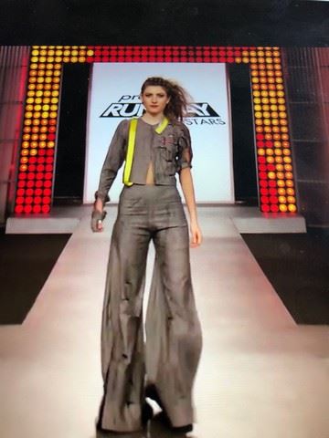 Project Runway All Stars, Season 6, Episode 2: "Damsels in Distress" - Garment # 618, - Designer: Char. Char used charcoal and a grater to design this 2- piece look with grey denim wide leg pants with front slits and a matching grey denim jacket. The back of the jacket has red lettering on the back that reads: "DET FIRE DEPT". The entire look is ripped and the jacket has one yellow suspender that drapes over the right should and around the neck. The breast pocket area has a red outlined, closed up zipper on the breast.