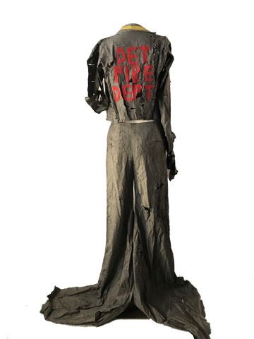 Project Runway All Stars, Season 6, Episode 2: "Damsels in Distress" - Garment # 618, - Designer: Char. Char used charcoal and a grater to design this 2- piece look with grey denim wide leg pants with front slits and a matching grey denim jacket. The back of the jacket has red lettering on the back that reads: "DET FIRE DEPT". The entire look is ripped and the jacket has one yellow suspender that drapes over the right should and around the neck. The breast pocket area has a red outlined, closed up zipper on the breast.
