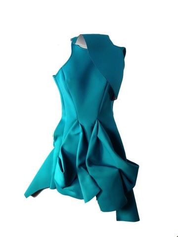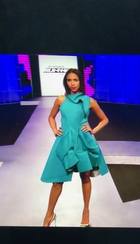Project Runway All Stars, Season 6, Episode 6: "Thrown for a Loop by Betty Boop" - Garment # 671- Designer: Char. Char designed a bright turquoise, sleeveless dress with the front of the skirt pulled up into a large ruffle design which also had a rounded collar with a wave in the fabric. The fabric used was neoprene which the judges felt was very difficult to work with. Char was eliminated in this episode because the silhouette was not representative of Betty Boop.