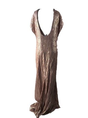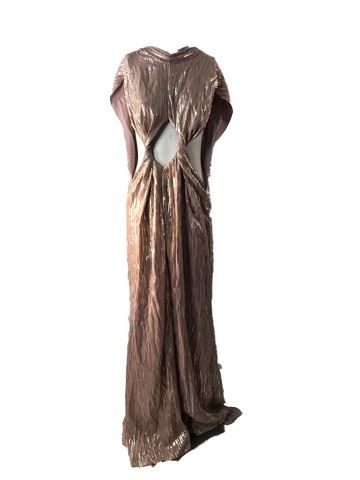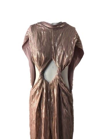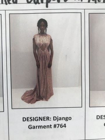 Project Runway All Stars, Season 7, Episode 6: "Pedal to the Metal" (Red Carpet with Metallics) - Garment # 764 -Django. Django was inspired by The Oscars to design this pink and gold metallic, full length gown with a beaded neck line and large cutouts on the side of the dress. Twists of fabric create an open center in the front. The skirt has a long center slit and a short train and is designed with an open back.