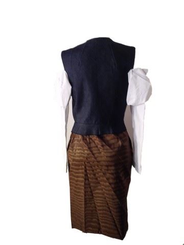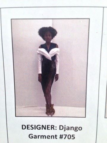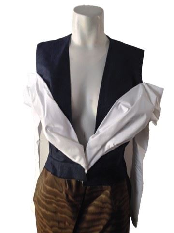 Project Runway All Stars, Season 7, 1: "All Stars Goes Global" - Garment # 705 - Designer: Django. Django designed a 2-piece look with a denim vest and sewn on cotton white sleeves that are off the shoulder and connected in the front of the dress. A brown taffeta skirt that fastens in the front and has a large slit completes this look. His design is based on his hometown of The Netherlands.