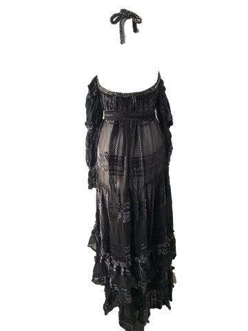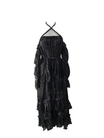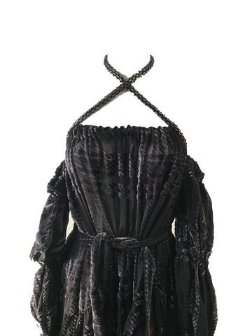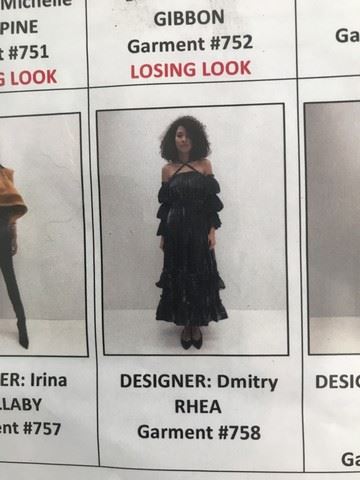 Project Runway All Stars, Season 7, Episode 5: "On the Prowl" - Garment # 758-Designer: Dmitry. Dmitry had a Rhea (ostrich like bird) in mind when he designed this charcoal, velvet, long sleeved ruffled dress with bare shoulders and a beaded criss-cross neck tie. Judges rated this design high on their list in this episode.