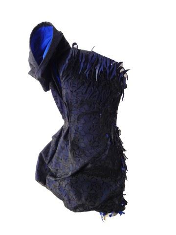 Project Runway All Stars - Season 6, Episode 2: "Damsels in Distress"-garment #628- Designer: Edmond. Edmond used a blowtorch, shredder and spray paint to finish this piece. He designed a short, structured asymmetrical strapless front dress (one diagonal strap across the back), made of embroidered black mesh with bright blue lining and fringe feather. The dress has sculptured detailing that was hand sewn along the neck and side. The dress also includes a matching black clutch.