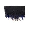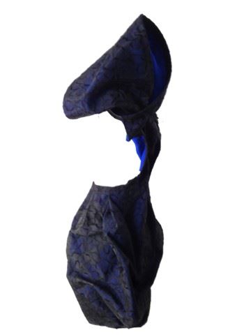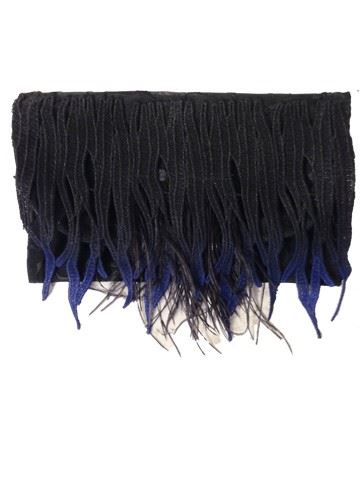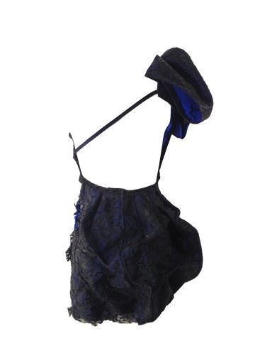 Project Runway All Stars - Season 6, Episode 2: "Damsels in Distress"-garment #628- Designer: Edmond. Edmond used a blowtorch, shredder and spray paint to finish this piece. He designed a short, structured asymmetrical strapless front dress (one diagonal strap across the back), made of embroidered black mesh with bright blue lining and fringe feather. The dress has sculptured detailing that was hand sewn along the neck and side. The dress also includes a matching black clutch.