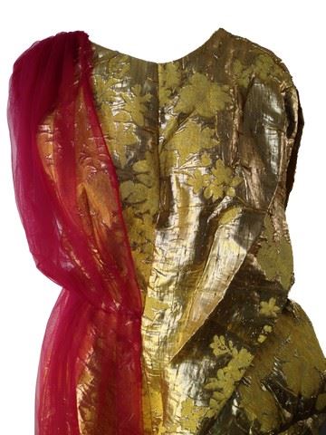 Project Runway All Stars - Season 7, Episode 2: "Graduation Celebration" - Garment #717 - Designer: Django. Burgundy and yellow foil mini dress with burgundy organza draped and fitted over the right side. The left side is bunched up and sewn to stay in a bubbly form. The ensemble has a deep v-neck in the back.