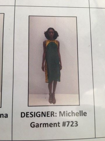 Project Runway All Stars - Season 7, Episode 2: "Graduation Celebration" - Garment #723 - Designer: Michelle. Michelle designed a green and gold laced mid length, sleevless, see-thru dress. The gold lace borders the outside of the dress and the green lace sits in a dimaond shape design with a green see-thru mesh outline. A green lace undergarment band is also included.