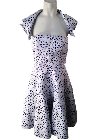 Project Runway All Stars - Season 7, Episode 2: "Graduation Celebration" - Garment #716 - Designer: Jasper. A white neoprene like eyelet lace floral laser cut, strapless, flared dress with blue lining. Comes with matching shrug.