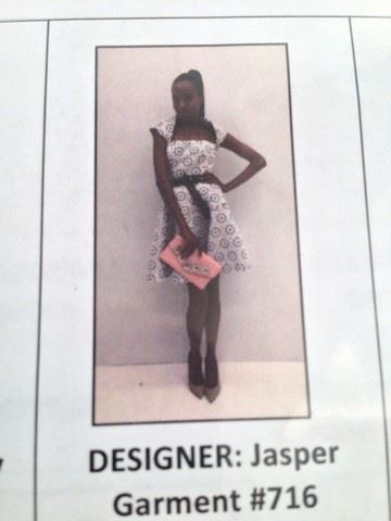 Project Runway All Stars - Season 7, Episode 2: "Graduation Celebration" - Garment #716 - Designer: Jasper. A white neoprene like eyelet lace floral laser cut, strapless, flared dress with blue lining. Comes with matching shrug.