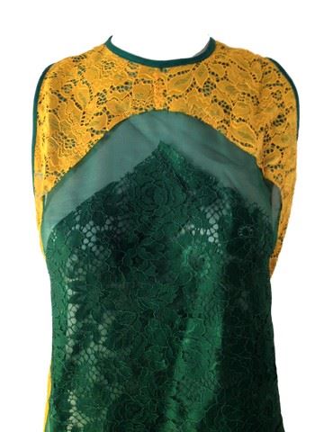 Project Runway All Stars - Season 7, Episode 2: "Graduation Celebration" - Garment #723 - Designer: Michelle. Michelle designed a green and gold laced mid length, sleevless, see-thru dress. The gold lace borders the outside of the dress and the green lace sits in a dimaond shape design with a green see-thru mesh outline. A green lace undergarment band is also included.
