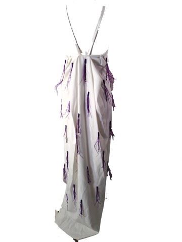 Project Runway All Stars - Season 7, Episode 2: "Graduation Celebration" - Garment #718 - Designer: Sean Kelly. This is a long, white, deep v-neck strappy dress with royal purple, floating ostric feathers. Sean hand embroidered beads to the ostrich feathers. The front of the dress has a high center slit and the back of the dress picks up at the mid back to meet the straps.