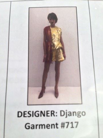 Project Runway All Stars - Season 7, Episode 2: "Graduation Celebration" - Garment #717 - Designer: Django. Burgundy and yellow foil mini dress with burgundy organza draped and fitted over the right side. The left side is bunched up and sewn to stay in a bubbly form. The ensemble has a deep v-neck in the back.