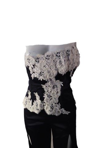 Project Runway All Stars- Season 7- Episode 4: "Corsets of Fashion"- Garment # 743- Designer: Jasper- Jasper designed this black, satin corset with a white lace graphic covering the torso. He used a black, stretch fabric to create double vented, tailored trousers. Lace for a headdress also included. Jasper called this piece: "behind every great man is a great woman". He also said this silhouette is "symbolic of freedom". Jasper was elminated in this episode.