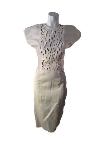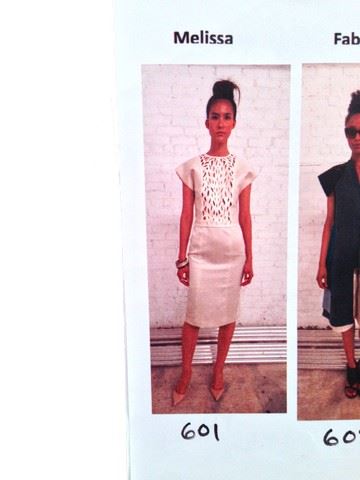 Project Runway All Stars, Season 6, Episode 1: "Rookies vs. Veterans" -Garment # 1 - Designer: Melissa (veteran). Melissa designed a 2- piece cream colored skirt with a leather trim laser cut out crop top.