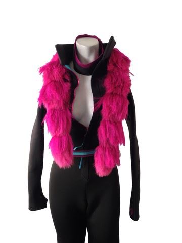 Project Runway All Stars, Season 6, Episode 11: "Nina's Crushing It" - Garment # 713-Designer: Edmond. The theme of the challenge was to create a resort wear look inspired by a land within the app game: "Candy Crush". Edmond designed 3-piece look inspired by a mountainside resort. It is a black, long sleeve, tight fitting, neoprene jumpsuit with thumbholes, a magenta faux fur scarf and a pink and teal custom neoprene belt. Edmond was eliminated on this episode because it was not a very inventive look for the runway.
