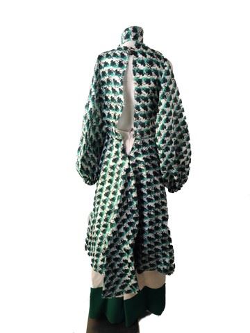 Project Runway All Stars, Season 6, Episode 11: "Nina's Crushing It" - Garment # 709 - Designer: Stanley. The theme of the challenge was to create a resort wear look inspired by a land within the app game: "Candy Crush". Stanley designed a 3-piece look for lakeside resort wear. It is a green and white printed, silk gazar, long sleeve wrap style dress with a matching neck scarf and white with a deep green border, wide leg pants to peak through. Stanley cut on the bias so the dress would be more fluid in movement. The dress has many hand sewn sections to create the wrap effect and to volumize the sleeves. This design received high scores from the judges in this episode.