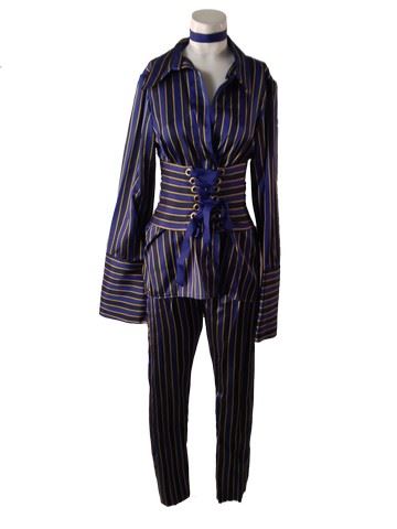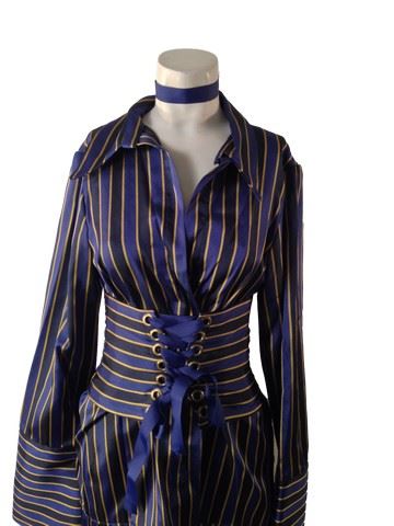 Project Runway All Stars, Season7 , Episode 4: "Corsets of Fashion" - Designer: Sean. This is a 2-piece look created with navy blue, gold and black striped satin top with a laced corset built in. Matching, tailored pants complete the ensemble. The top is shaped like a dress shirt with cuffs that extend past the model's hands.