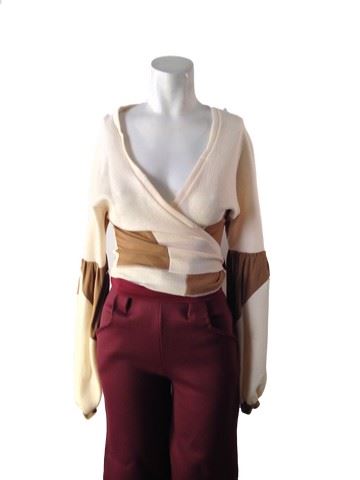 Project Runway All Stars- Season 6, Episode 1: "Rookies vs. Veterans" -Garment # 609- Designer: Amanda (rookie). Amanda designed a maroon wide leg pant with a tan and white long sleeve wrap top that has puffy long sleeves.