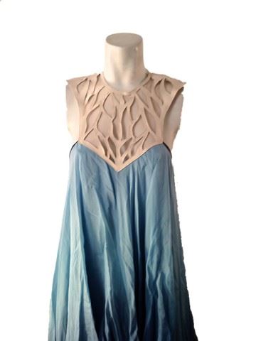 Project Runway All Stars- Season 6, Episode 1: "Rookies vs. Veterans"- Garment # 606- Designer: Ari (veteran). Ari designed a flouncy, blue, ombre dress with white laser cutouts on the top and the back of the dress, with navy satin capri pants.