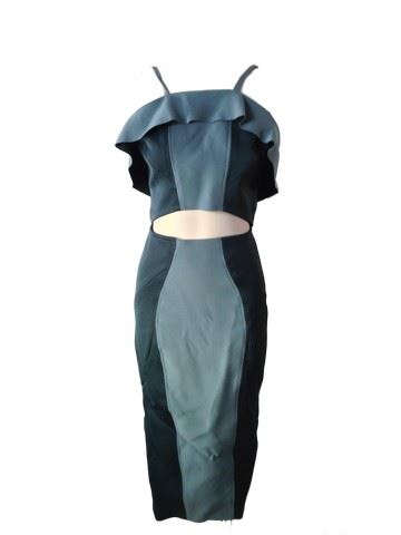 Project Runway All Stars- Season 6, Episode 1: "Rookies vs. Veterans" -Garment # 605- Designer: Helen (veteran). Helen designed a 2-toned blue, one piece, a-line skirt style dress with a flounce top and spaghetti straps. The front is cut at the midriff and closed in the back.