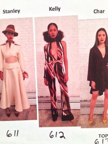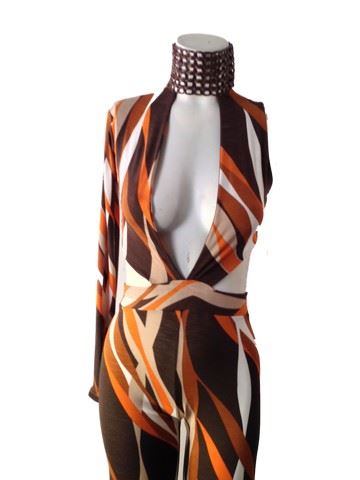 Project Runway All Stars- Season 6, Episode 1: "Rookies vs. Veterans" -Garment # 612- Designer: Kelly (rookie). Kelly designed a multi- colored orange, tan, dark and light brown, one sleeve jumpsuit with a deep V neck front and a cropped back. Comes with a braided leather collar for around the neck.
