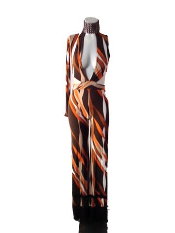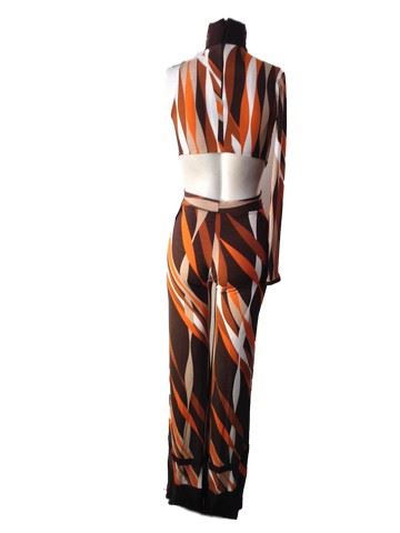 Project Runway All Stars- Season 6, Episode 1: "Rookies vs. Veterans" -Garment # 612- Designer: Kelly (rookie). Kelly designed a multi- colored orange, tan, dark and light brown, one sleeve jumpsuit with a deep V neck front and a cropped back. Comes with a braided leather collar for around the neck.